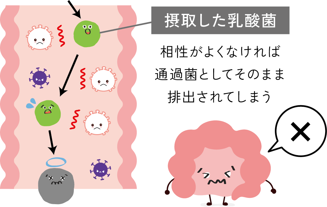 また、ヨーグルトや乳酸菌サプリをたくさん摂っていても、体質に合わない菌は『通過菌』として排出されてしまうことも。