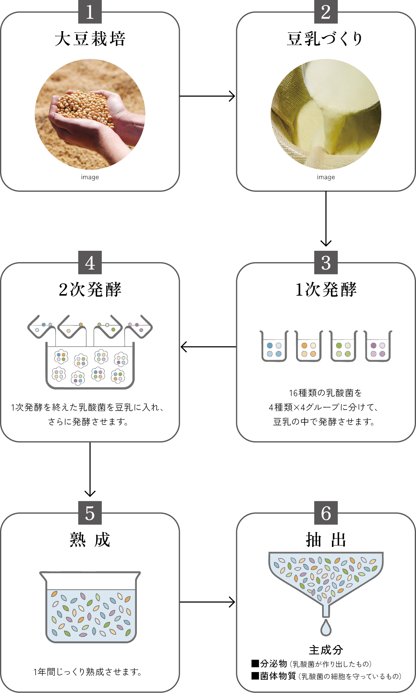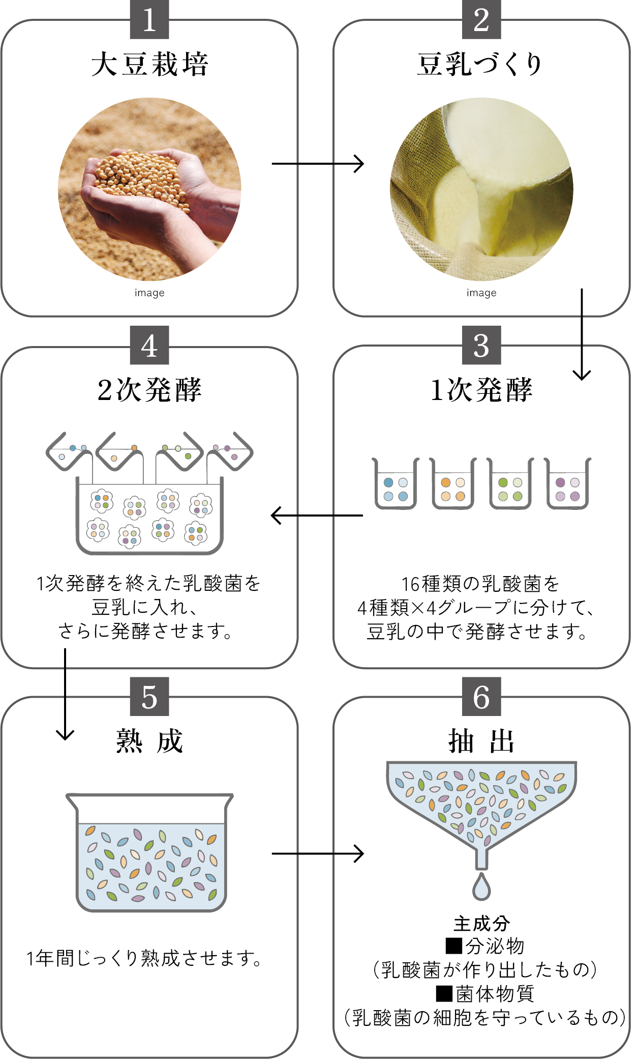 豆乳を16種類の乳酸菌で発酵させて作り出した分泌成分で、身近なものに例えると、納豆のねばねば(ナットウキナーゼ)と同じく、菌がつくり出した身体にいいものです。