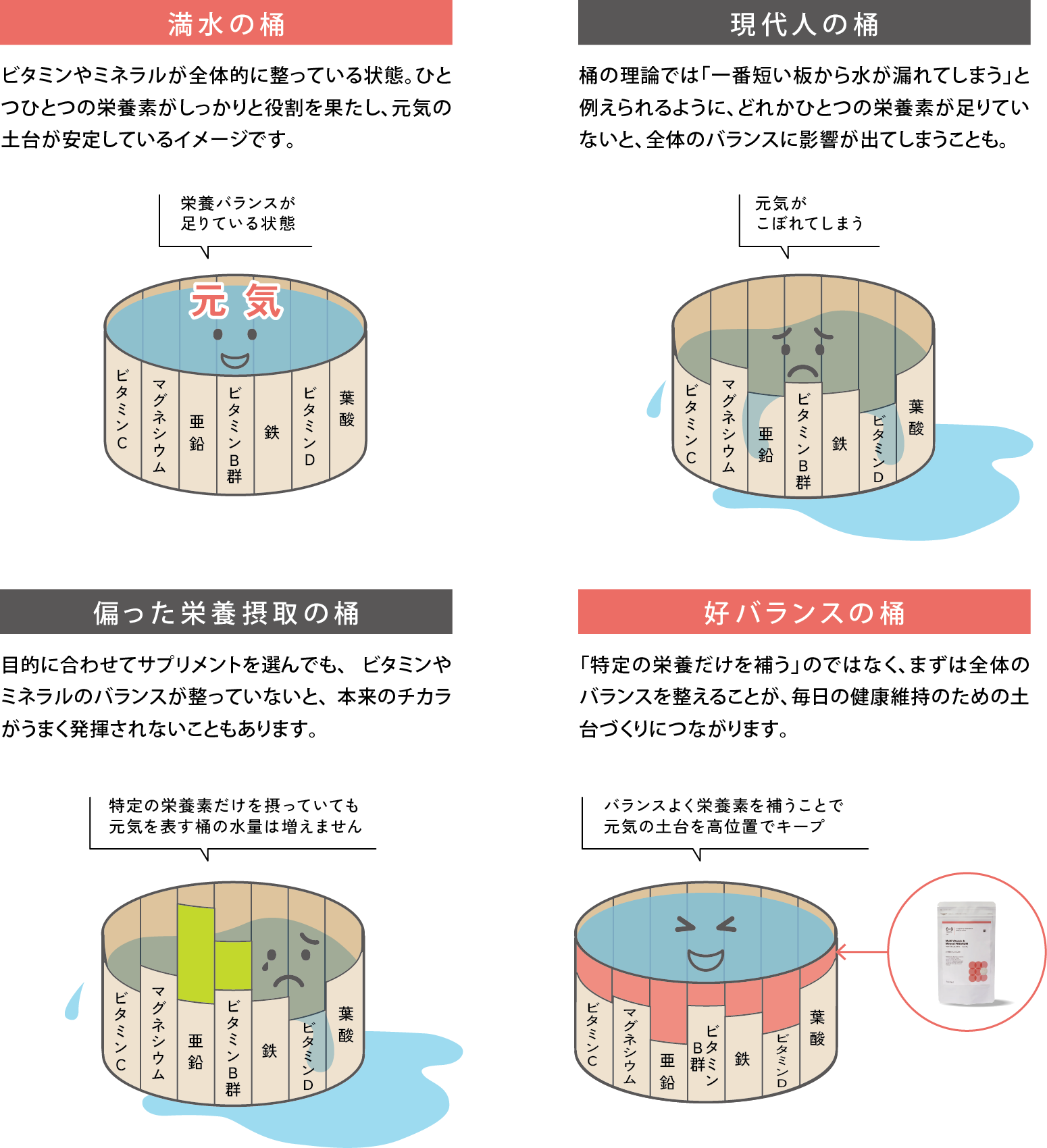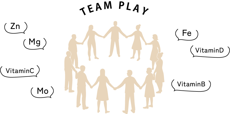 ビタミンやミネラルは、単独ではなく互いに連携して働く栄養素。どれかが不足すると、全体のバランスに影響が出ることもあります。そのため、相性や組み合わせを考えたバランス設計にこだわりました。