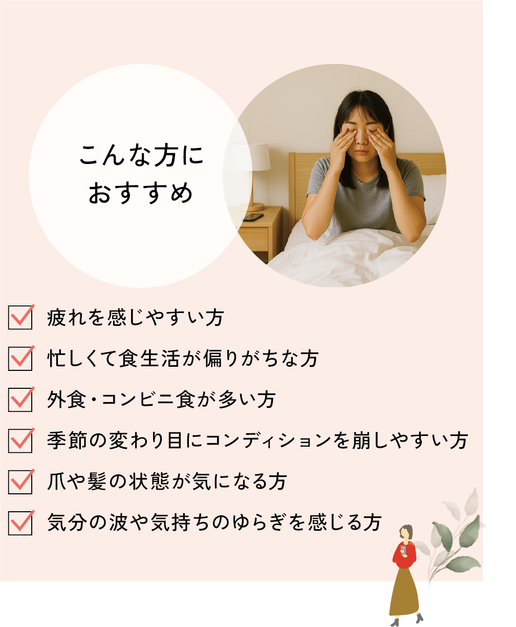 ビタミン12種+ミネラル8種を、効率的に補えるよう設計。毎日の食事だけでは摂りにくい栄養を、この1商品でサポートします。