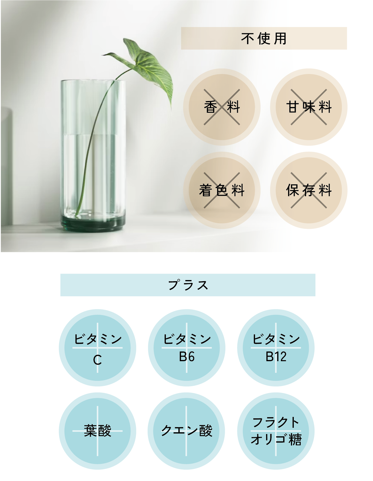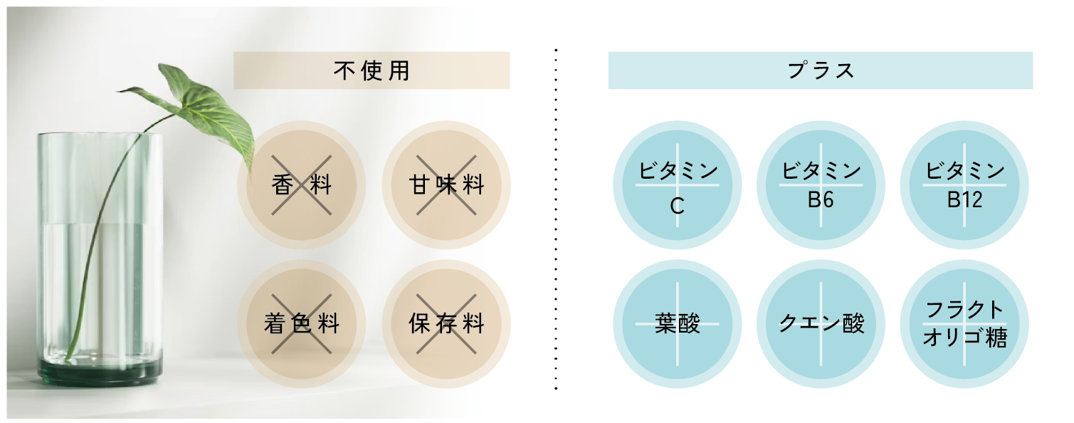 香料・甘味料・着色料・保存料は不使用。ビタミンC、B6、B12、葉酸、クエン酸、フラクトオリゴ糖を組み合わせました。