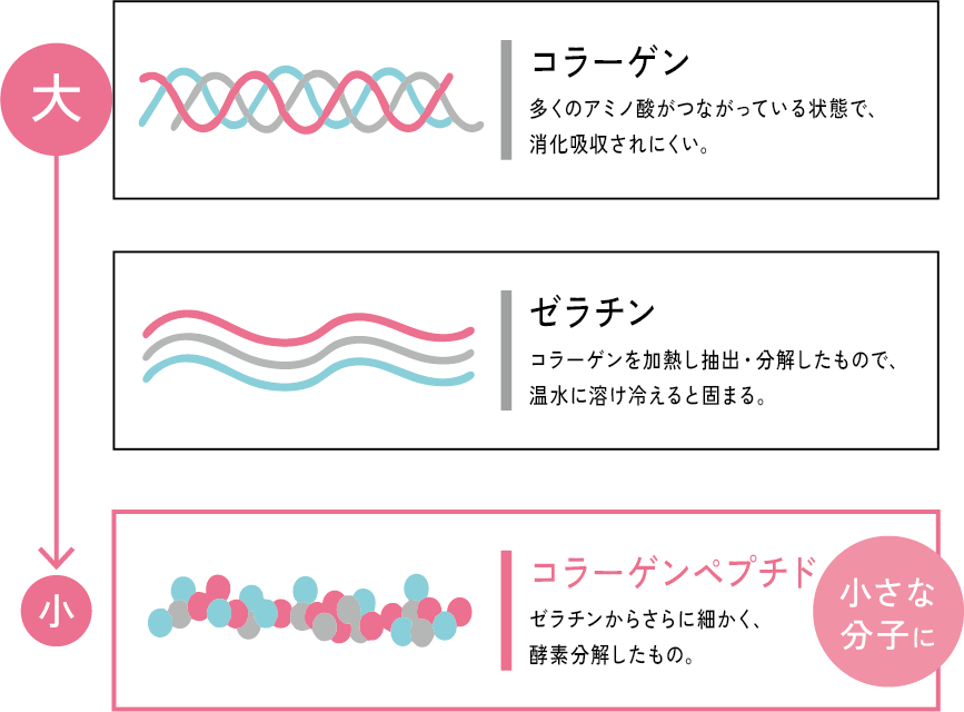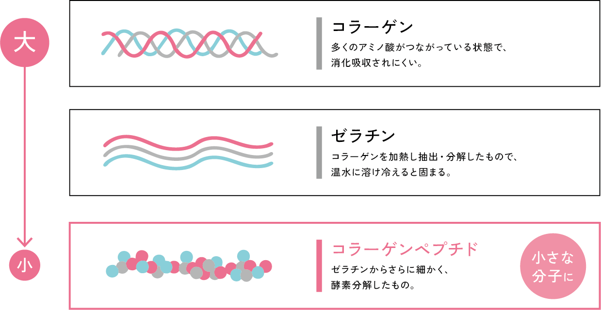 コラーゲンは分子が大きいのが特徴です。酵素で細かく分解し「コラーゲンペプチド(低分子化)」とすることで、小さな分子に仕上げています。